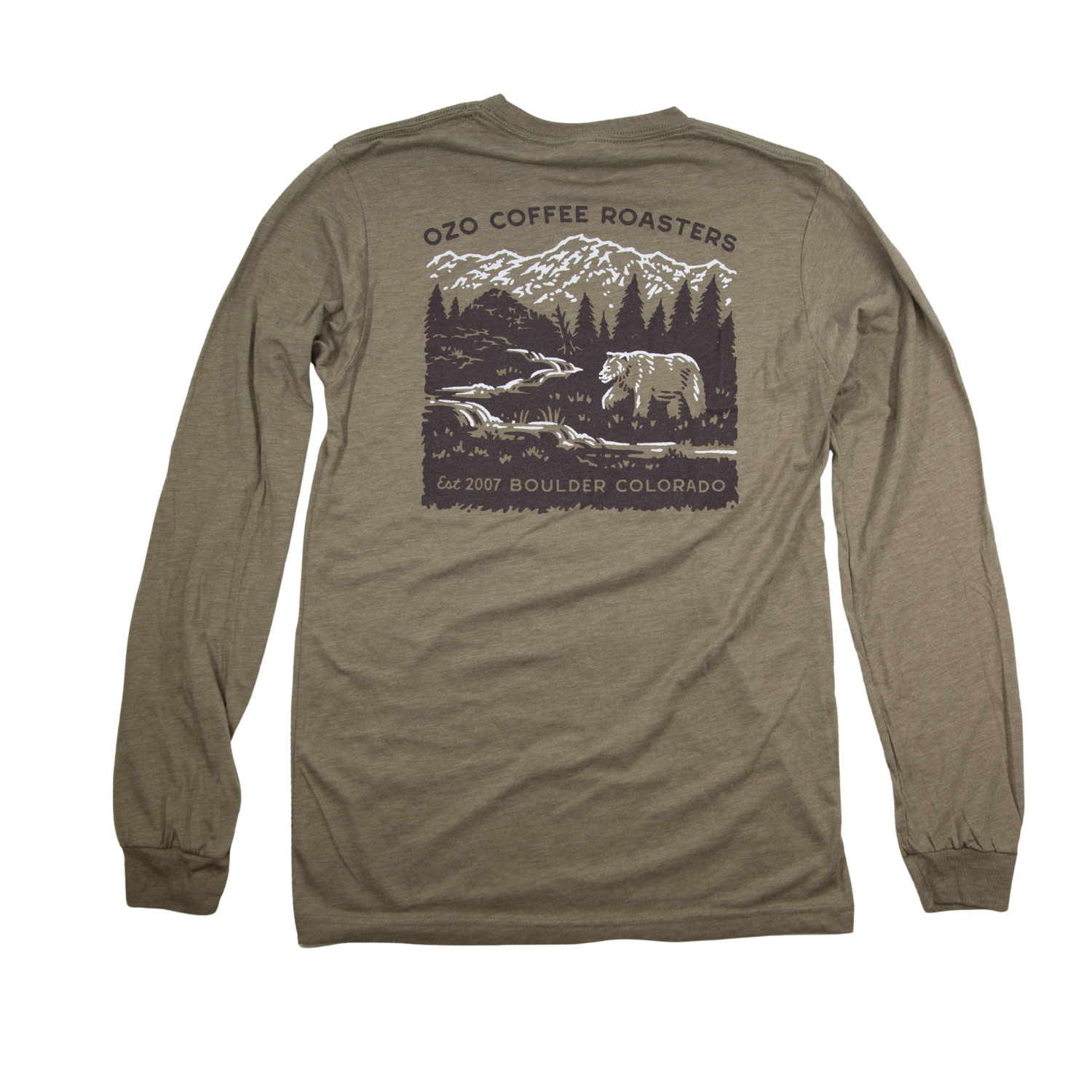 Bring a little Colorado wilderness with you wherever you go. Our Bear Long Sleeve Tee features a hand-drawn mountain and forest scene inspired by OZO’s Boulder roots, complete with a wandering bear and river landscape on the back.