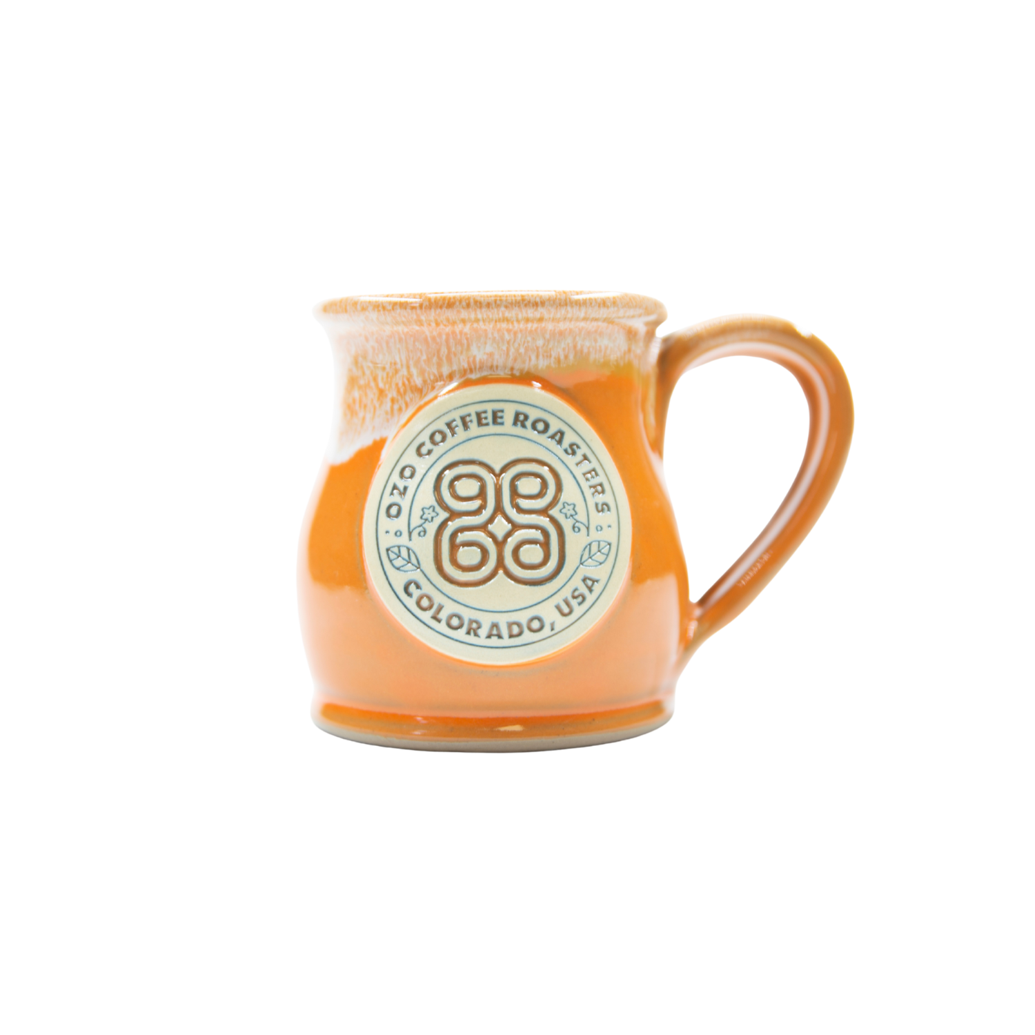 Featuring a beautiful Sunset Orange glaze with a Dijon White accent, this cozy two-tone design radiates the warmth of a Colorado sunrise. The classic OZO Coffee Roasters medallion adds a timeless touch that feels right at home in your kitchen—or around the campfire.